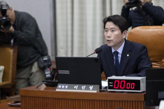 더불어민주당 이인영 국회 운영위원장이 28일 오후 서울 여의도 국회에서 열린 운영위 전체회의를 주재하고 있다.