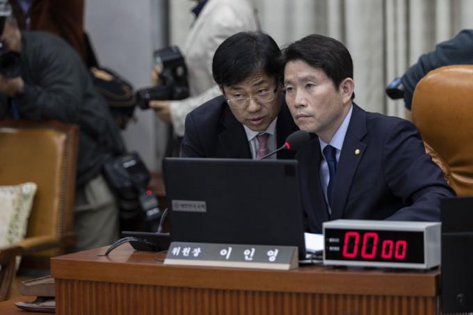 더불어민주당 이인영 국회 운영위원장이 28일 오후 서울 여의도 국회에서 열린 운영위 전체회의에 참석해 수석전문위원과 대화하고 있다.