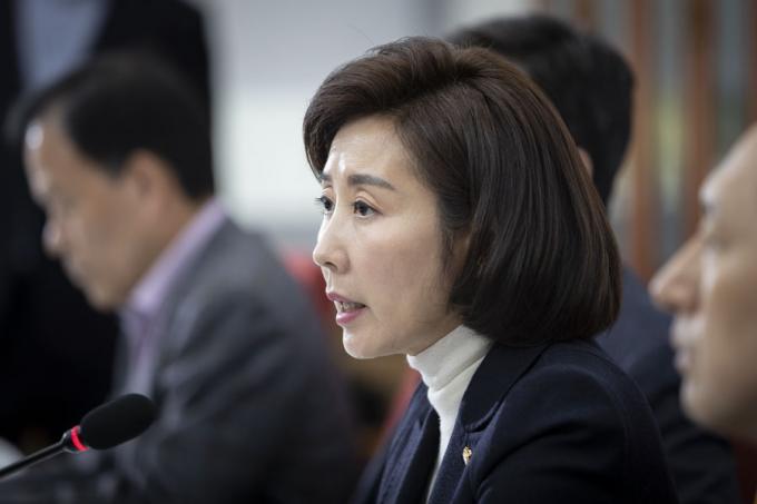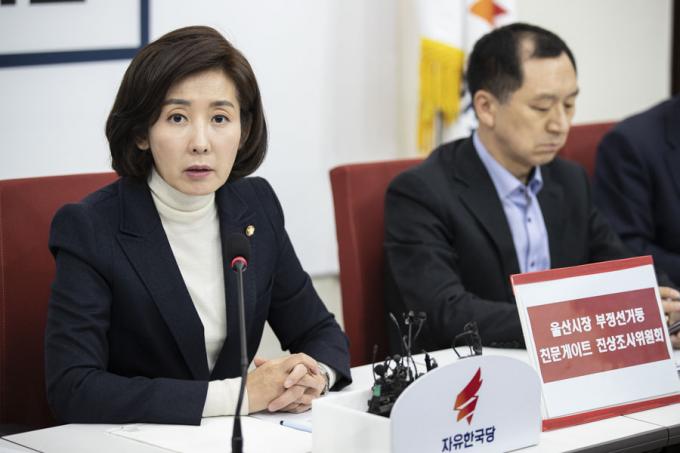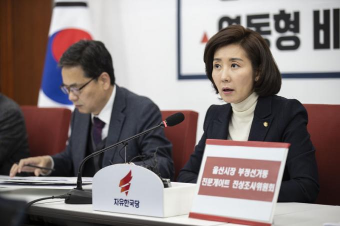 자유한국당 나경원 원내대표(왼쪽)가 28일 오후 서울 여의도 국회에서 열린 '울산시장 부정선거 등 친문게이트 진상조사위원회 1차회의'에 참석해 발언하고 있다.