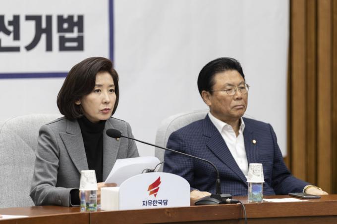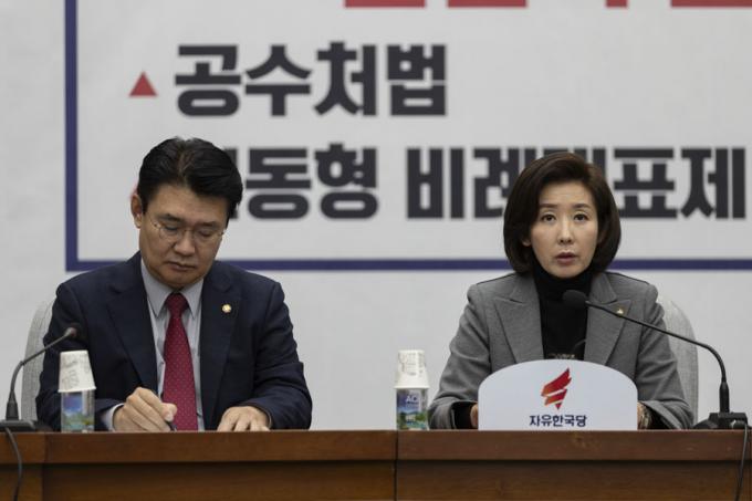자유한국당 나경원 원내대표(왼쪽)가 29일 오전 서울 여의도 국회에서 열린 한국당 원내대책회의에 참석해 발언하고 있다.