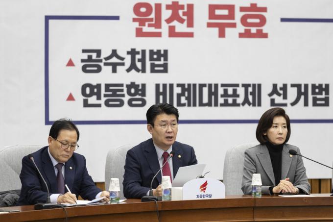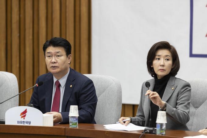 자유한국당 정용기 정책위의장(왼쪽)가 29일 오전 서울 여의도 국회에서 열린 한국당 원내대책회의에 참석해 발언하고 있다.