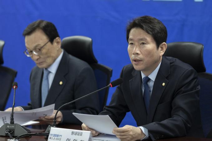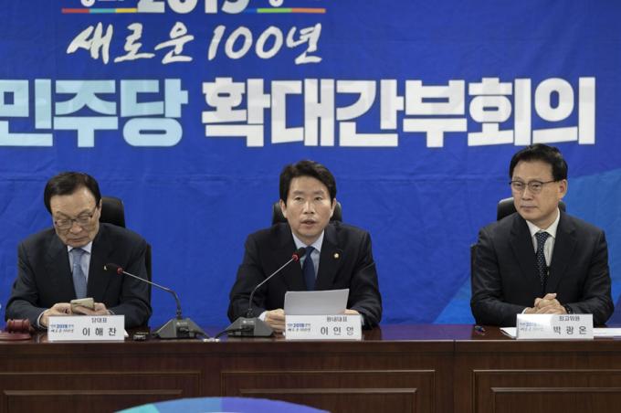 더불어민주당 이인영 원내대표(가운데)가 29일 오전 서울 여의도 국회에서 열린 민주당 확대간부회의에 참석해 발언하고 있다.