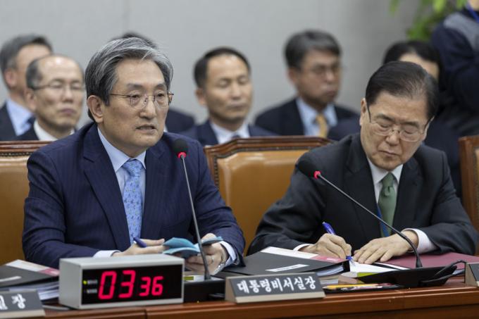 노영민 대통령 비서실장(왼쪽)이 29일 오전 서울 여의도 국회에서 열린 운영위원회 전체회의에 출석해 의원 질의에 답하고 있다.