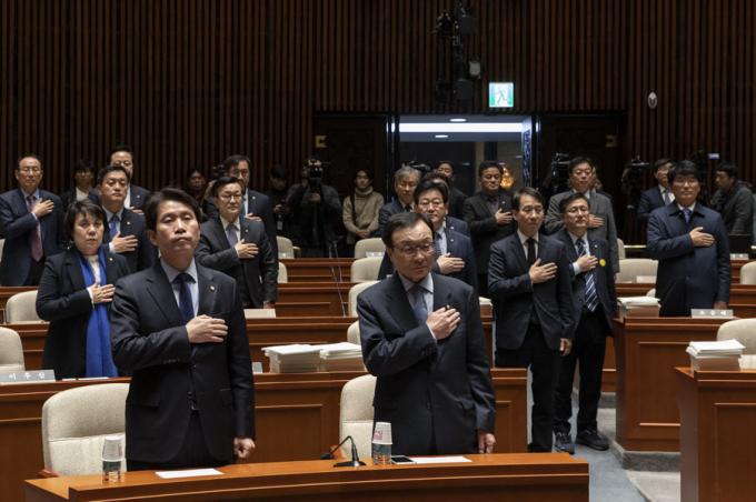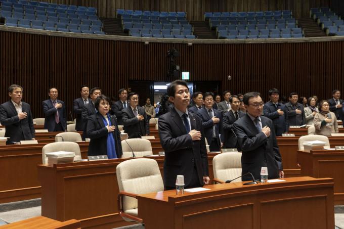 더불어민주당 이해찬 대표, 이인영 원내대표를 비롯한 민주당 의원들이 29일 오후 서울 여의도 국회에서 열린 의원총회에 참석해 국민의례를 하고 있다.