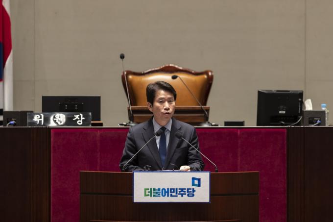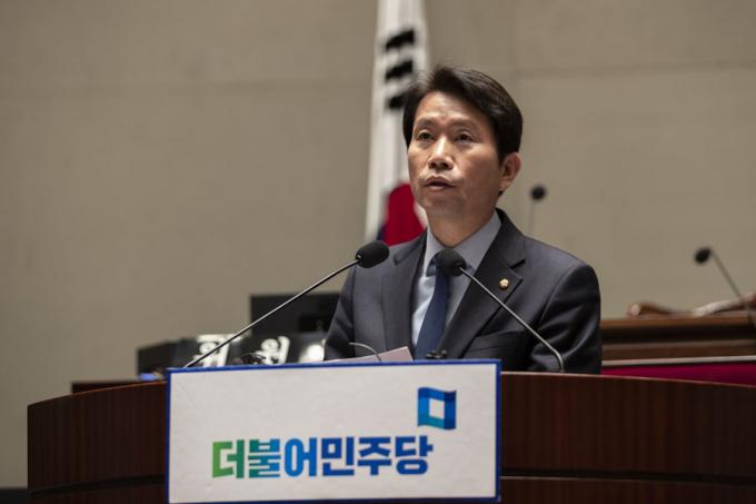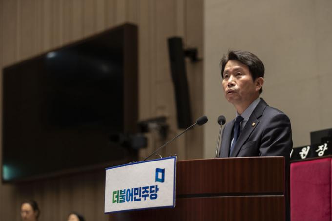 더불어민주당 이인영 원내대표가 29일 오후 서울 여의도 국회에서 열린 의원총회에 참석해 발언하고 있다.