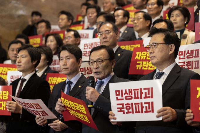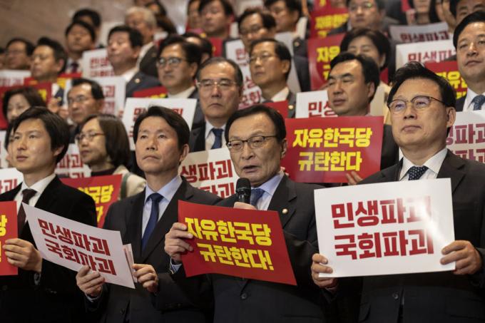 더불어민주당 이해찬 대표(왼쪽 세번째)가 29일 오후 서울 여의도 국회 로텐더홀 계단에서 열린 자유한국당 규탄 대회에 참석해 발언하고 있다.