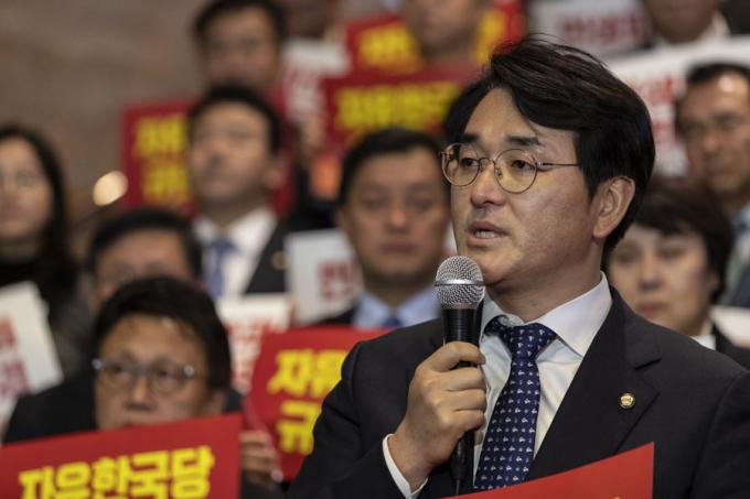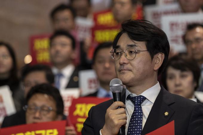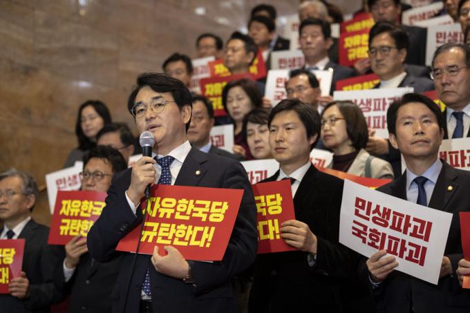더불어민주당 박용진 의원이 29일 오후 서울 여의도 국회 로텐더홀 계단에서 열린 자유한국당 규탄 대회에 참석해 규탄 발언을 하고 있다.