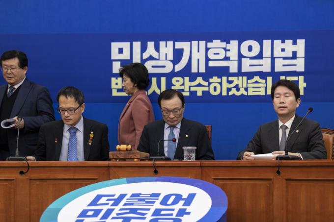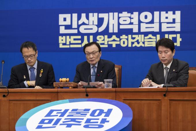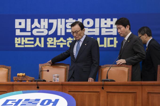 더불어민주당 이해찬 대표(왼쪽)와 이인영 원내대표가 2일 오전 서울 여의도 국회에서 열린 민주당 최고위원회의에 참석하고 있다.