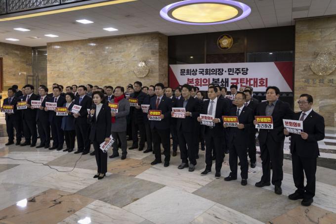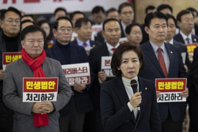 자유한국당 나경원 원내대표가 2일 오전 서울 여의도 국회 본회의장 앞에서 열린 '문희상 국회의장·민주당 본회의 봉쇄 규탄대회'에 참석해 발언하고 있다.
