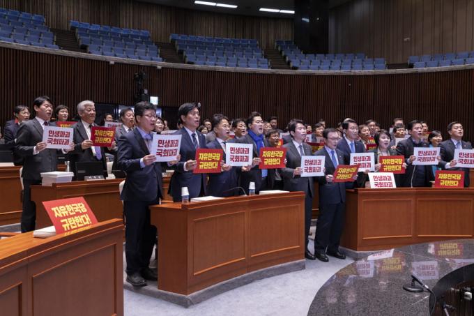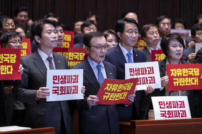 더불어민주당 이해찬 대표(왼쪽 두번째), 이인영 원내대표(맨왼쪽)를 비롯한 민주당 의원들이 2일 오후 서울 여의도 국회에서 열린 민주당 의원총회에 참석해 자유한국당 규탄 피켓을 들고 구호를 외치고 있다.