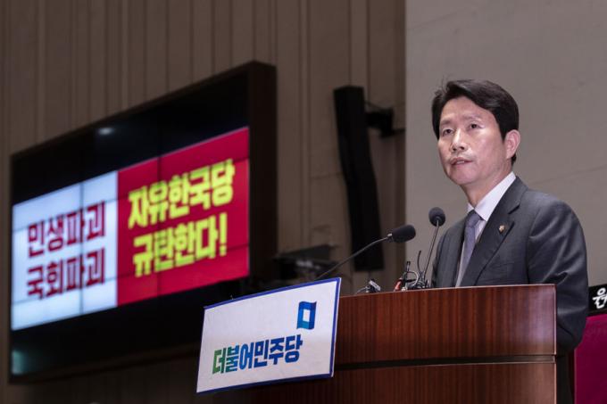 민주당 의원총회서 한국당 규탄하는 이인영 원내대표
