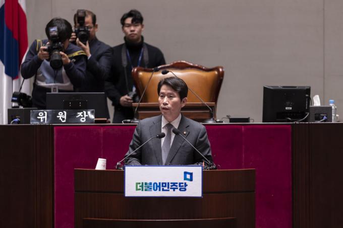 더불어민주당 이인영 원내대표가 2일 오후 서울 여의도 국회에서 열린 민주당 의원총회에 참석해 발언하고 있다.