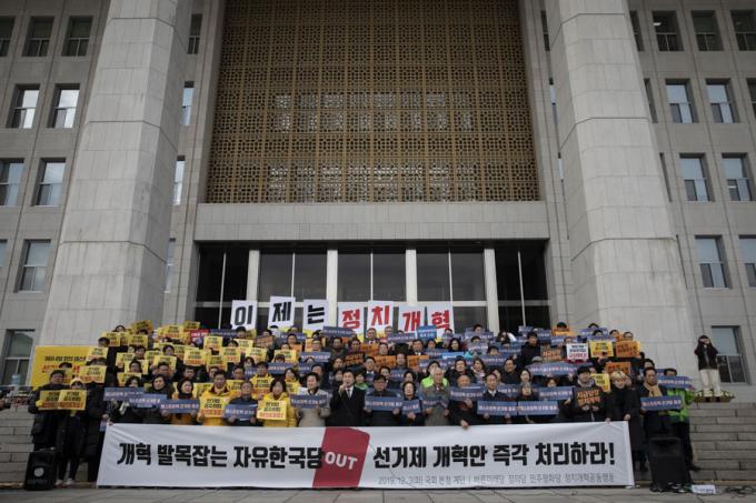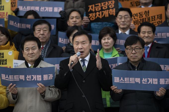 바른미래당 손학규 대표가 3일 오후 서울 여의도 국회 본관 앞 계단에서 열린 '개혁 발목잡는 자유한국당 규탄 및 선거제도 개혁 완수 결의 기자회견'에 참석해 패스트트랙 선거법 본회의 통과를 주장하고 있다.