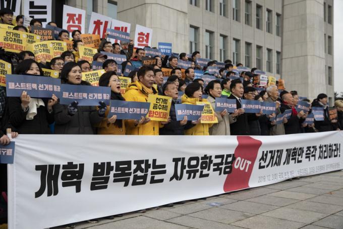 바른미래당 손학규 대표, 정의당 심상정 대표, 민주평화당 정동영 대표와 정치개혁공동행동 등 시민단체가 3일 오후 서울 여의도 국회 본관 앞 계단에서 열린 '개혁 발목잡는 자유한국당 규탄 및 선거제도 개혁 완수 결의 기자회견'에 참석해 구호를 외치고 있다.