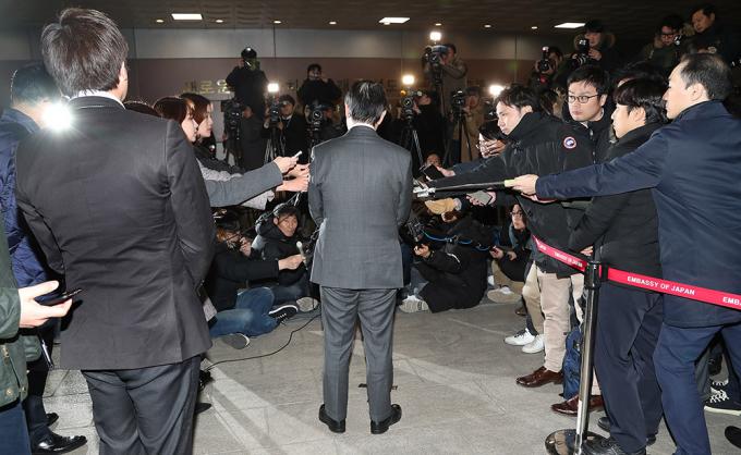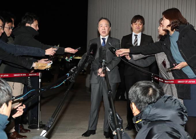 도미타 고지 신임 주한 일본대사가 3일 김포국제공항을 통해 입국해 기자들의 질문에 대답하고 있다.