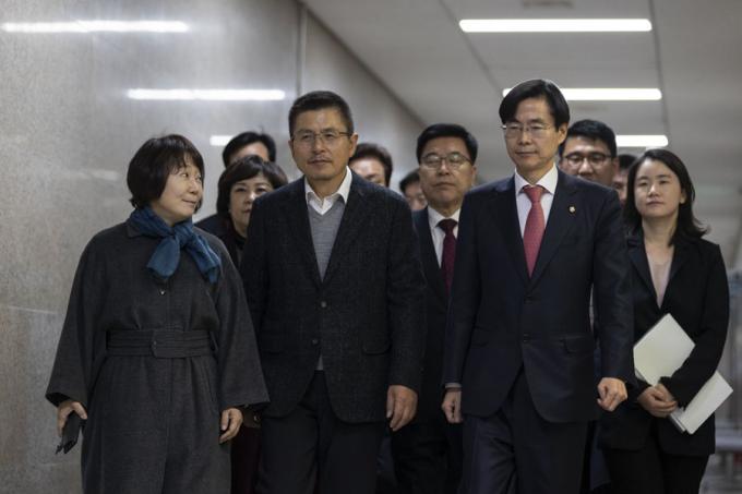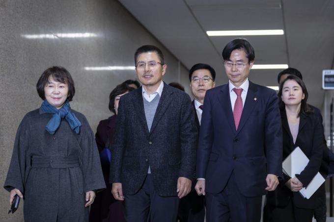 자유한국당 황교안 대표(가운데)가 5일 오전 서울 여의도 국회에서 열린 한국당 최고위원회의에 참석하고 있다.