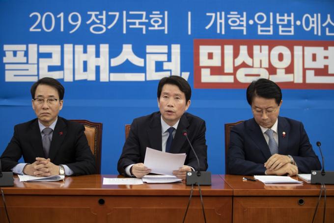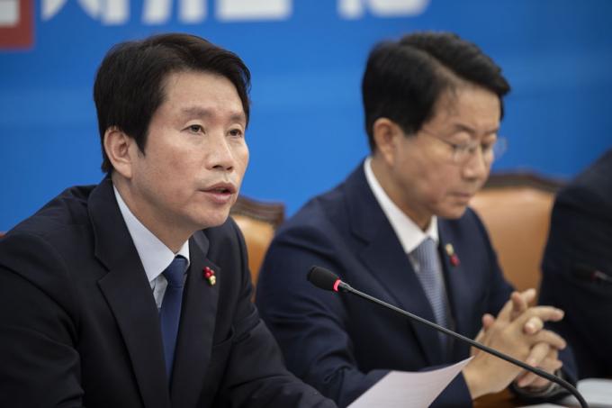 더불어민주당 이인영 원내대표(왼쪽)가 5일 오전 서울 여의도 국회에서 열린 민주당 정책조정회의에 참석해 발언하고 있다.