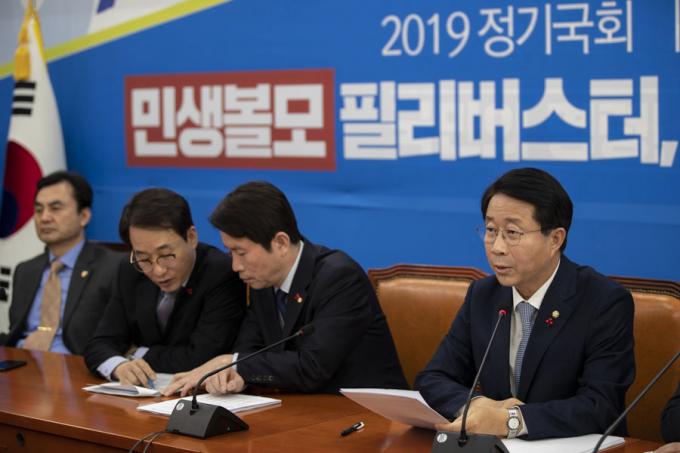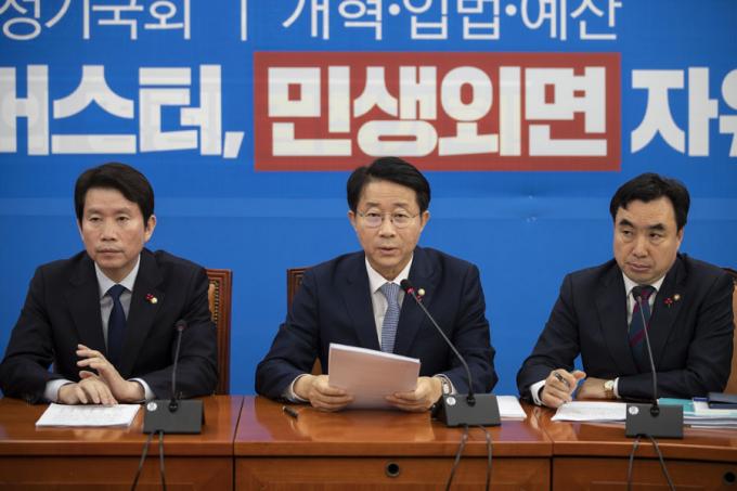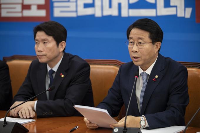 더불어민주당 조정식 정책위의장(가운데)가 5일 오전 서울 여의도 국회에서 열린 민주당 정책조정회의에 참석해 발언하고 있다.
