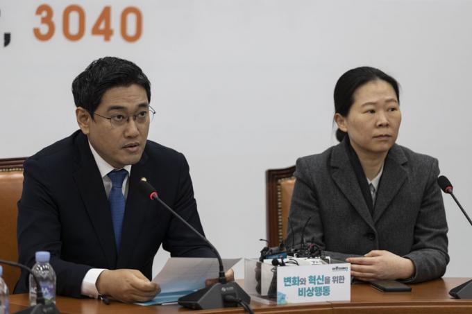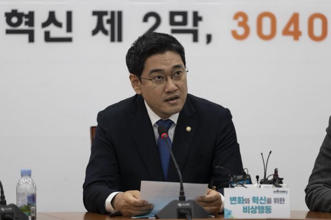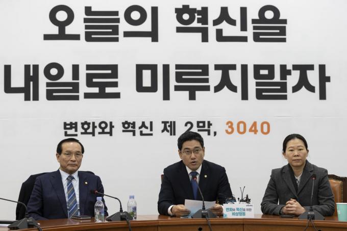 변화와 혁신을 위한 비상행동(변혁) 오신환 대표(가운데)가 5일 오전 서울 여의도 국회에서 열린 변혁 비상행동 회의에 참석해 발언하고 있다.