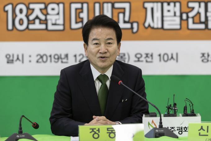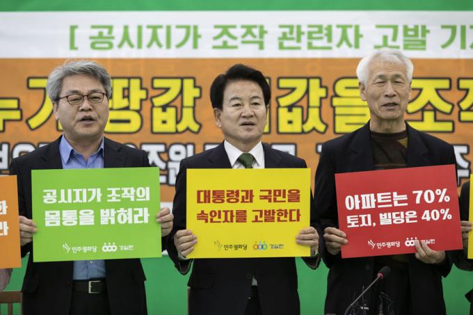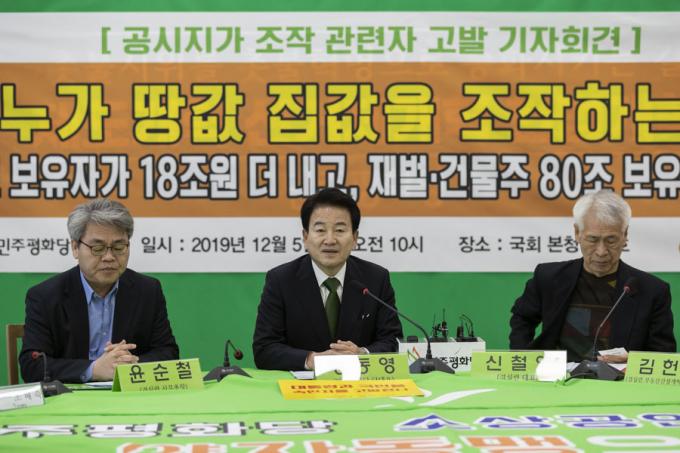 민주평화당 정동영 대표(가운데)가 5일 오전 서울 여의도 국회에서 열린 '공시가격 조작관련자 검찰 고발 설명회'에 참석해 피켓을 들고 구호를 외치고 있다.