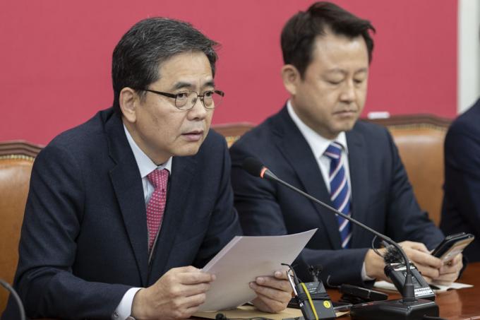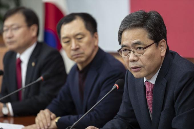 자유한국당 곽상도 의원(오른쪽)이 5일 오전 서울 여의도 국회에서 열린 '울산시장 부정선거 등 친문게이트 진상조사위원회 회의'에 참석해 발언하고 있다.