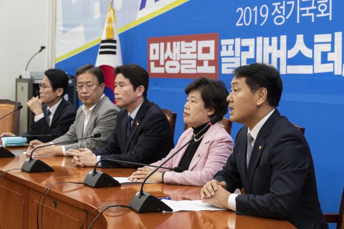 바른미래당 김관영 최고위원이 5일 오후 서울 여의도 국회 민주당 원내대표실에서 열린 원내대표급 4+1 협의체 회동에 참석해 발언하고 있다. 왼쪽부터 정의당 윤소하 대표, 대안신당 유성엽 대표, 더불어민주당 이인영 원내대표, 민주평화당 조배숙 원내대표, 김관영 최고위원.
