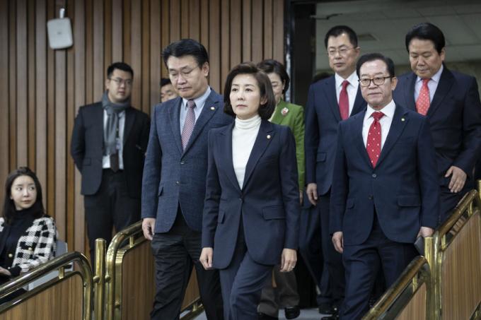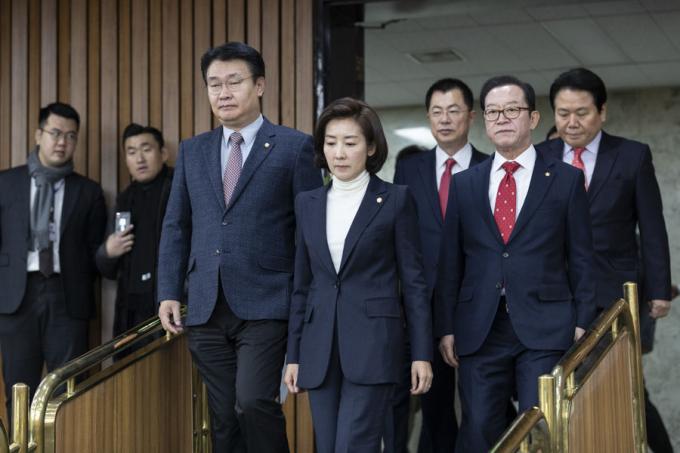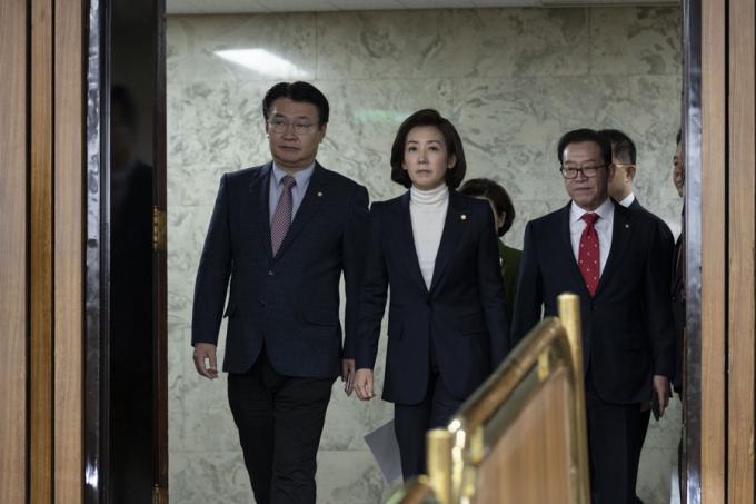 자유한국당 나경원 원내대표(가운데)가 6일 오전 서울 여의도 국회에서 열린 한국당 원내대책회의에 참석하고 있다.