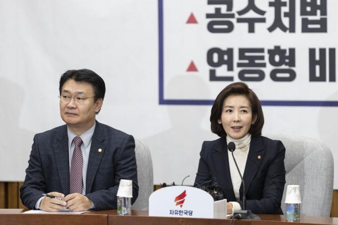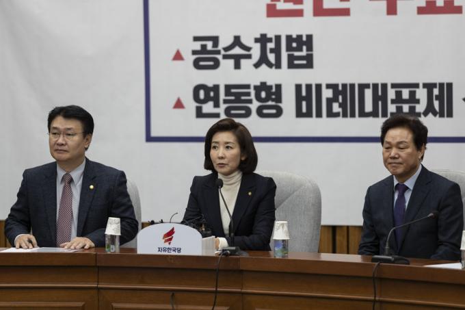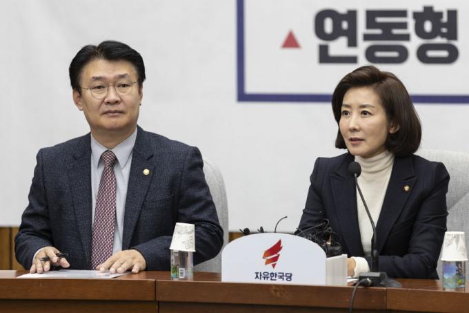 자유한국당 나경원 원내대표(오른쪽)가 6일 오전 서울 여의도 국회에서 열린 한국당 원내대책회의에 참석해 발언하고 있다.