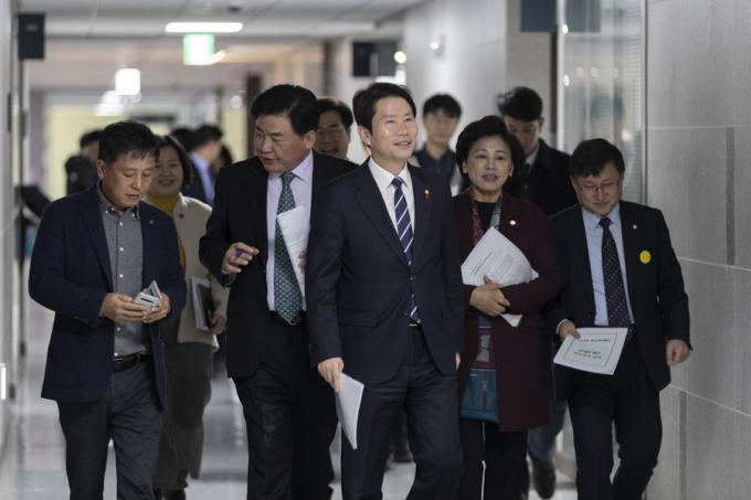 더불어민주당 이인영 원내대표(왼쪽 세번째)가 6일 오전 서울 여의도 국회 의원회관에서 열린 민주당 확대간부회의에 참석하기 위해 이동하고 있다.