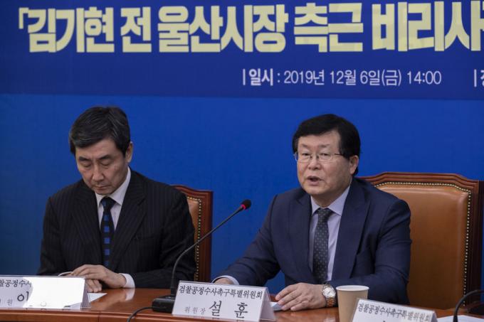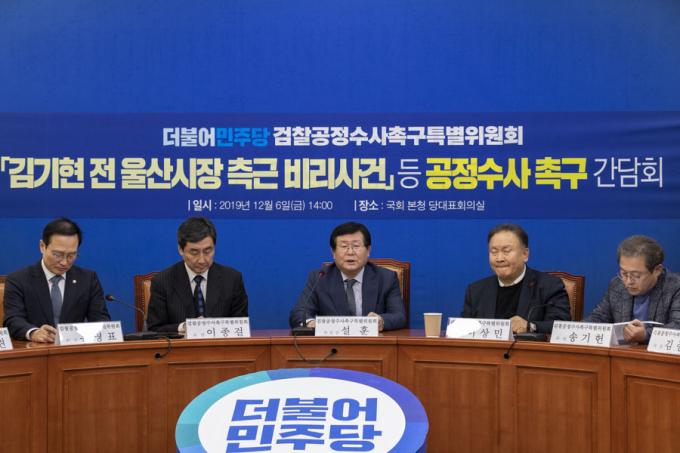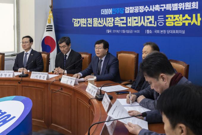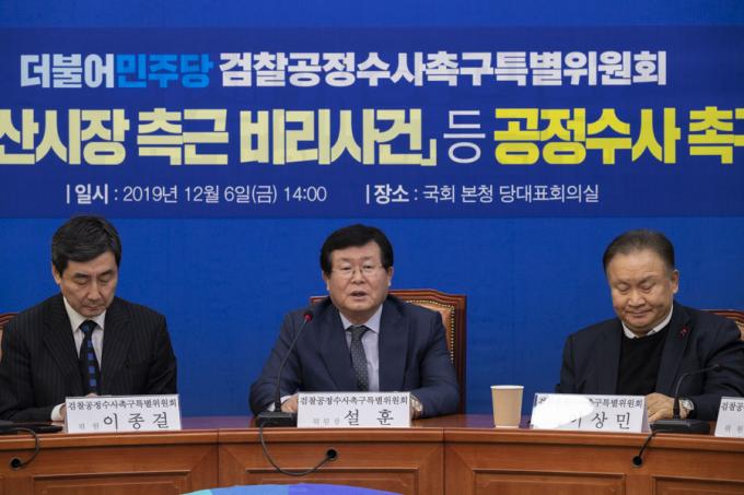 더불어민주당 설훈 의원(가운데)이 6일 오후 서울 여의도 국회에서 열린 '민주당 검찰공정수사촉구특별위원회 회의'에 참석해 발언하고 있다.