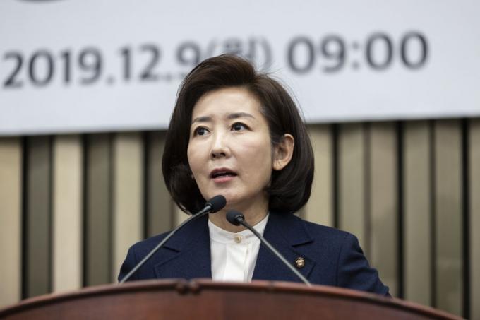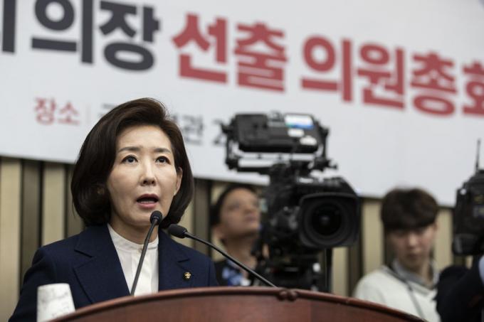 자유한국당 나경원 원내대표가 9일 오전 서울 여의도 국회에서 열린 '원내대표 및 정책위의장 선출을 위한 의원총회'에 참석해 발언하고 있다.