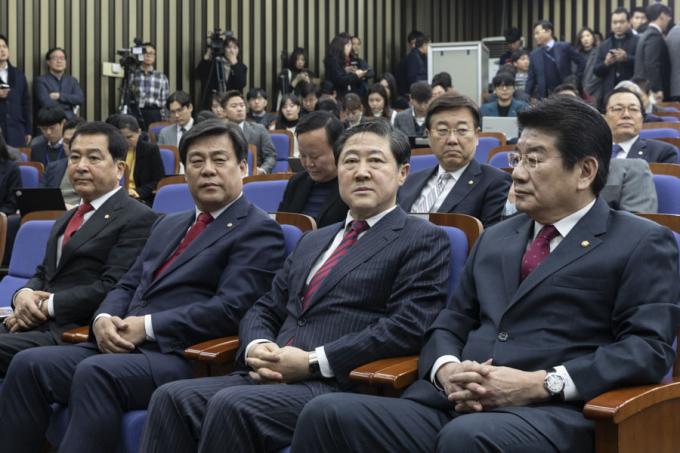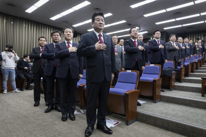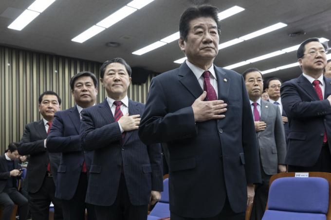 자유한국당 원내대표에 출마한 심재철(앞줄 왼쪽부터), 김선동, 유기준, 강석호 의원이 9일 오전 서울 여의도 국회에서 열린 원내대표 및 정책위의장 선출 의원총회에 참석해 국민의례를 하고 있다.