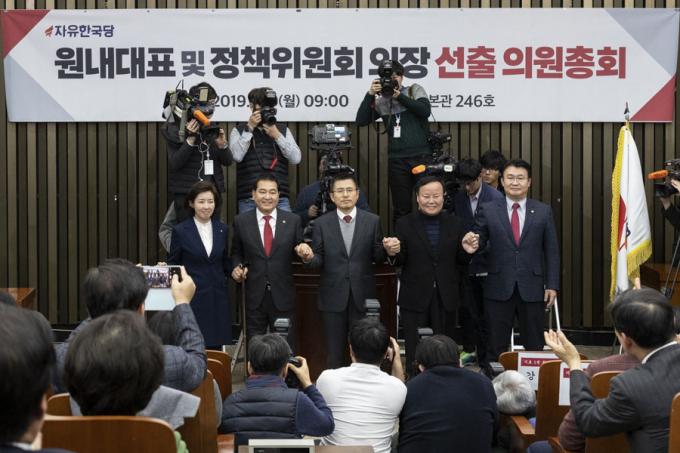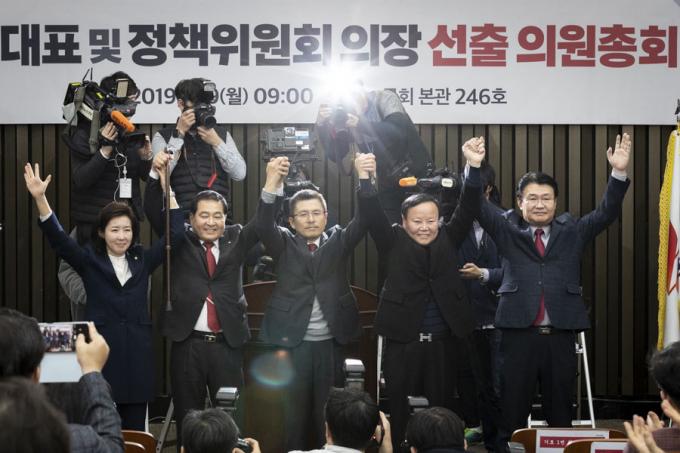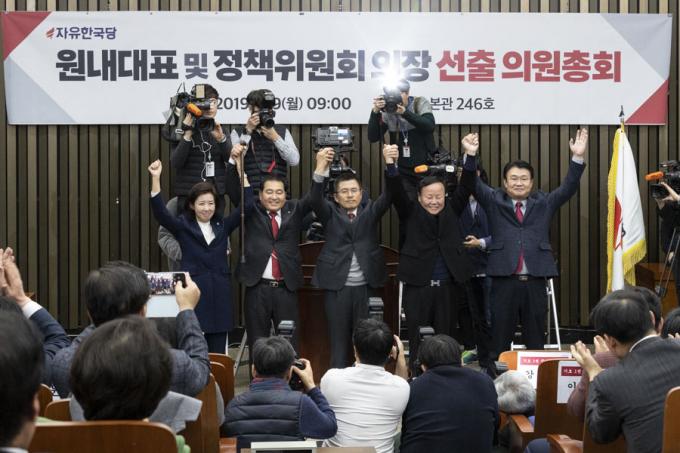 자유한국당 신임 원내대표로 선출된 심재철 의원이 9일 오전 서울 여의도 국회에서 열린 원내대표 경선에서 당선이 확정된 뒤 기념촬영을 하고 있다. 왼쪽부터 나경원 원내대표, 심재철 신임 원내대표, 황교안 대표, 김재원 신임 정책위의장, 정용기 정책위의장.
