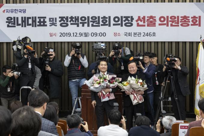 자유한국당 신임 원내대표로 선출된 심재철 의원(왼쪽)과 김재원 신임 정책위의장이 9일 오전 서울 여의도 국회에서 열린 원내대표 경선에서 당선이 확정된 뒤 기념촬영을 하고 있다.