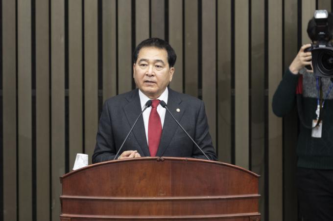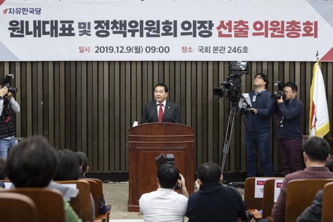 자유한국당 신임 원내대표로 선출된 심재철 의원(경기 안양 동안구, 5선)이 9일 오전 서울 여의도 국회에서 열린 원내대표 및 정책위의장 선출을 위한 의원총회에 참석해 당선 소감을 밝히고 있다.