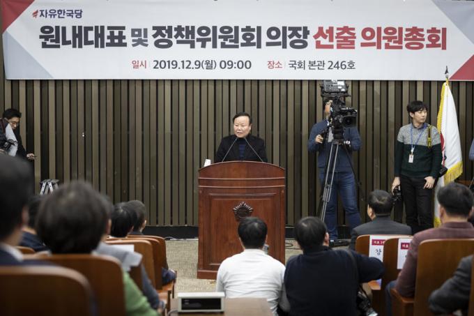 자유한국당 신임 정책위의장으로 선출된 김재원 의원(경북 상주·군위·의성·청송, 3선)이 9일 오전 서울 여의도 국회에서 열린 원내대표 및 정책위의장 선출을 위한 의원총회에 참석해 당선 소감을 밝히고 있다.