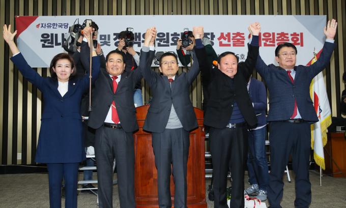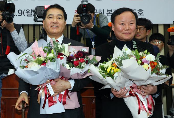 자유한국당 새 원내대표와 정책위의장으로 각각 선출된 심재철(왼쪽)·김재원 의원이 9일 오전 서울 여의도 국회에서 열린 의원총회에 참석해 축하 꽃다발을 받고 기뻐하고 있다.