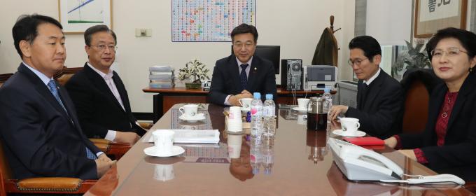 바른미래당 김관영 최고위원(왼쪽부터), 대안신당 유성엽 창당준비위원장, 더불어민주당 윤호중 사무총장, 정의당 윤소하 원내대표, 민주평화당 박주현 의원이 9일 오전 서울 여의도 국회에서 여야 4+1 선거법 협의체 회동을 하고 있다.