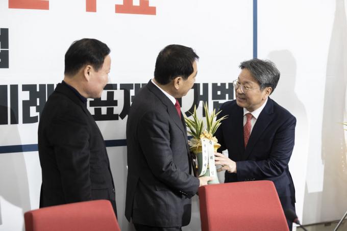 강기정 청와대 정무수석(오른쪽)이 9일 오후 서울 여의도 국회에서 자유한국당 심재철 신임 원내대표와 김재원 신임 정책위의장을 찾아 당선 축하인사를 전하며 난을 전달하고 있다.
