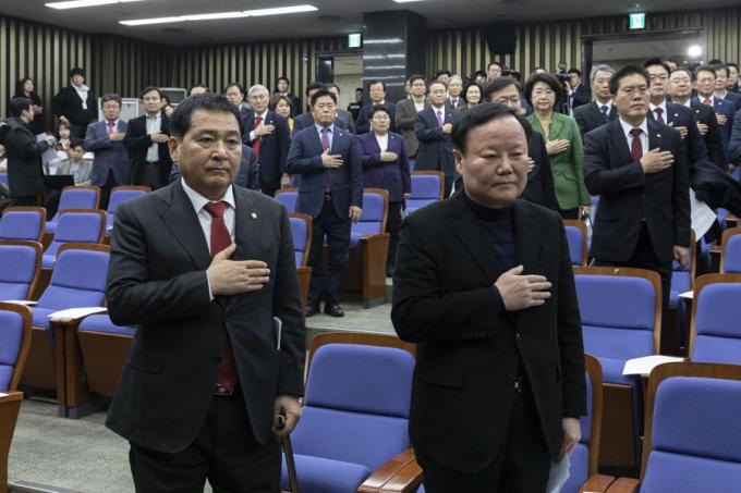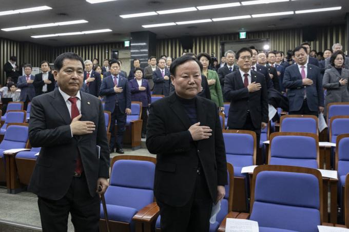 자유한국당 심재철 신임 원내대표(왼쪽)와 김재원 신임 정책위의장이 9일 오후 서울 여의도 국회에서 열린 한국당 의원총회에 참석해 국민의례를 하고 있다.