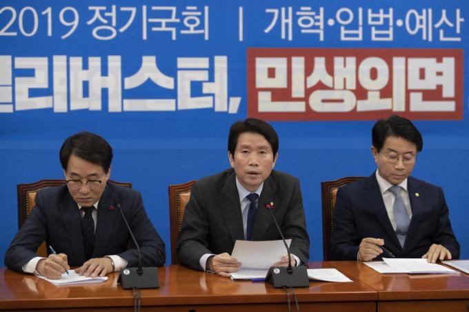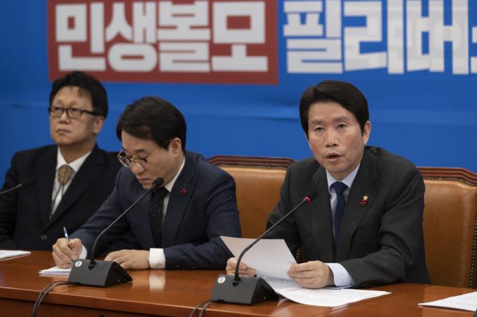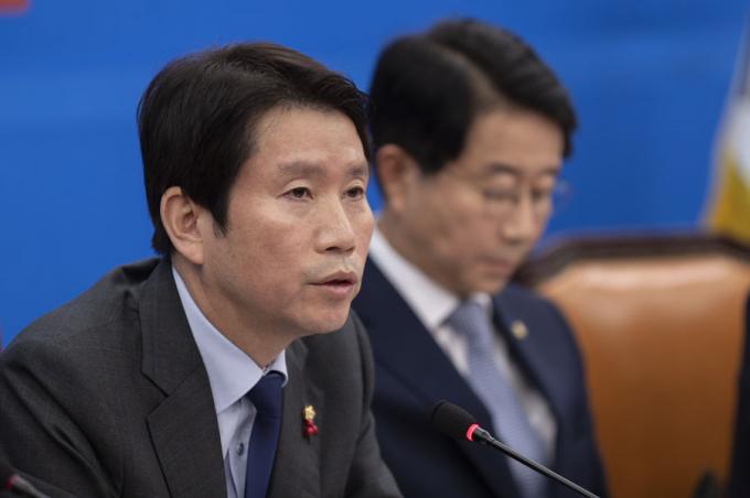 더불어민주당 이인영 원내대표(왼쪽)가 10일 오전 서울 여의도 국회에서 열린 민주당 원내대책회의-상임위간사단 연석회의에 참석해 발언하고 있다.