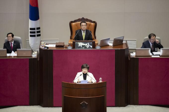 더불어민주당 전혜숙 의원이 10일 오전 서울 여의도 국회에서 열린 제371회국회(정기회) 제12차 본회의에 참석해 '도로교통법 일부개정법률안' 제안 설명을 하고 있다.
