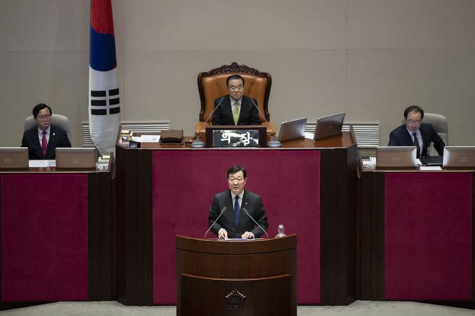 더불어민주당 민홍철 의원이 10일 오전 서울 여의도 국회에서 열린 제371회국회(정기회) 제12차 본회의에 참석해 '국군부대의 소말리아 아덴만 해역 파견연장 동의안' 제안 설명을 하고 있다.