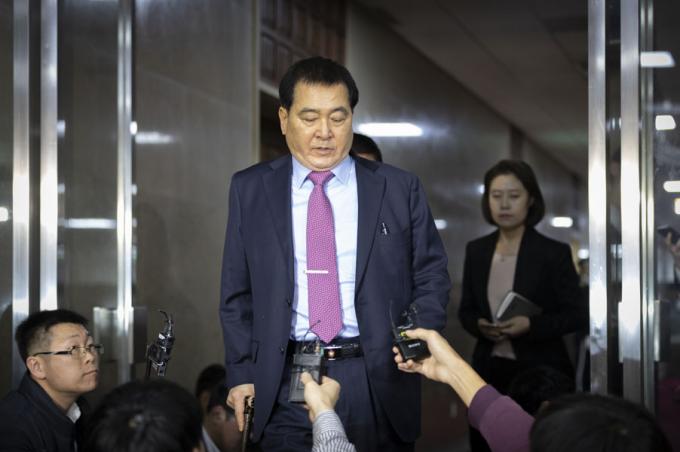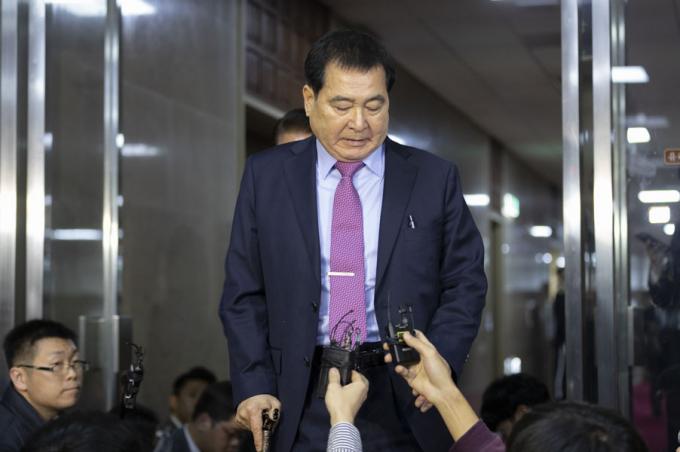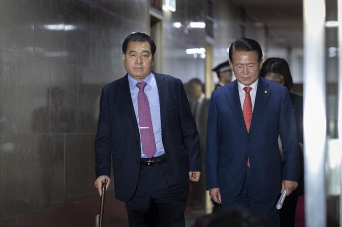 자유한국당 심재철 원내대표(왼쪽)가 10일 오후 서울 여의도 국회 의장실에서 열린 국회의장-여야3당 원내대표 및 예결위 간사 협의 중 의장실을 나서고 있다.