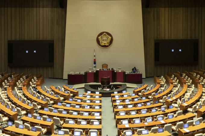 국회의장-여야3당 원내대표 및 예결위 간사 협의가 진행되고 있는 10일 오후 서울 여의도 국회 본회의장이 정회로 텅 비어 있다.