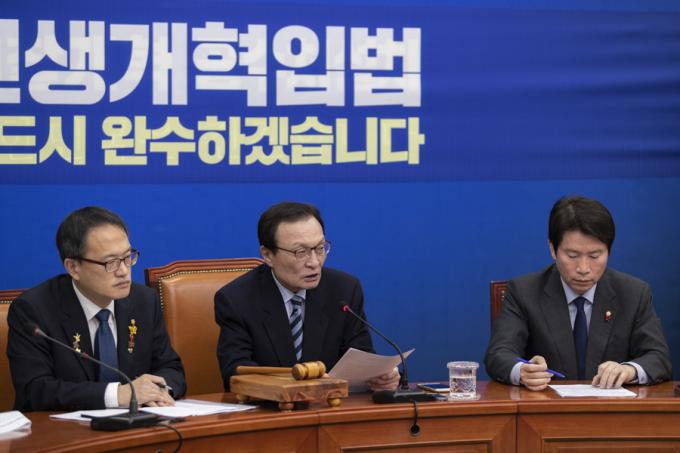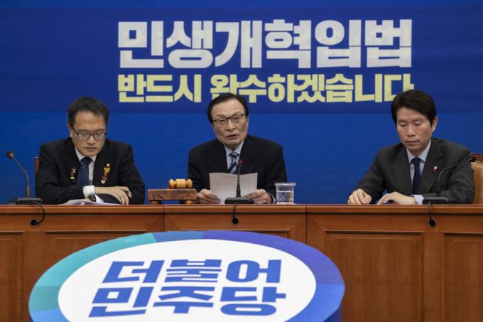 더불어민주당 이해찬 대표(가운데)가 11일 오전 서울 여의도 국회에서 열린 민주당 최고위원회의에 참석해 발언하고 있다.