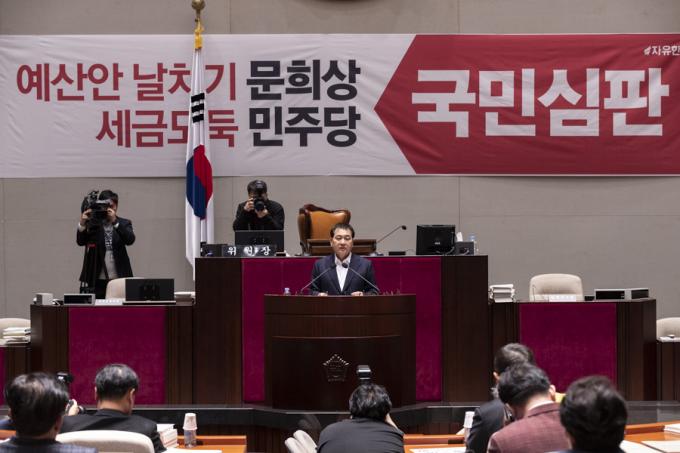 자유한국당 심재철 원내대표가 11일 오후 서울 여의도 국회 예결위 회의장에서 열린 한국당 의원총회에 참석해 발언하고 있다.