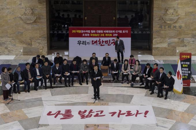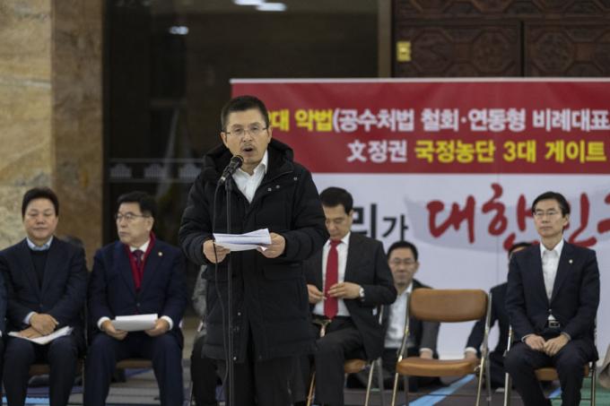 자유한국당 황교안 대표가 12일 오전 서울 여의도 국회 로텐더홀에서 열린 한국당 최고위원회의에 참석해 발언하고 있다.