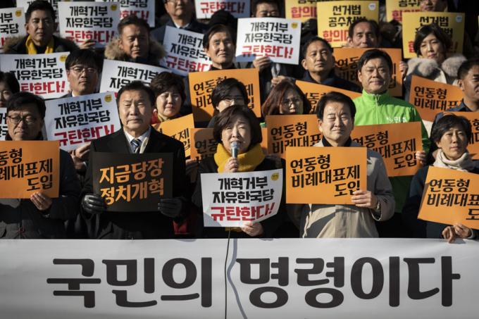 정의당 심상정 대표(앞줄 왼쪽 세번째)가 12일 오후 국회의사당 앞에서 열린 '선거개혁안 본회의 상정 및 후퇴 중단 촉구 기자회견'에서 발언하고 있다.