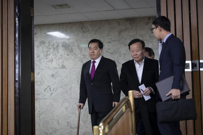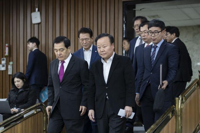 자유한국당 심재철 원내대표(왼쪽), 김재원 정책위의장이 13일 오전 서울 여의도 국회 제3회의장에서 열린 한국당 원내대책회의에 참석하고 있다.